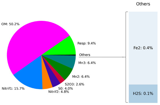 In the suboxic layer, where O concentrations are below 30 M above the sulphidic layer, photosynthesis is absent and respiration becomes negligible (see Figure 9 and Figure 10). In this zone, less oxygen is consumed for organic matter mineralization (approximately 25.9%), while consumption for the oxidation of reduced species and nitrification increases. A significant proportion of oxygen (43.5%) is utilized for the oxidation of both Mn(II) and Mn(III), contrasting with 12.8% in the oxic layer. Both stages of nitrification exhibit oxygen consumption levels similar to those observed in the oxic layer (21.7%), while the oxidation of iron becomes negligible (Figure 9 and Figure 10).