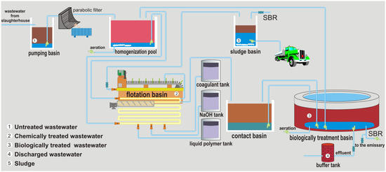 Throughout all the stages in the slaughterhouse production line, large amounts of water are consumed (15–20 L/chicken), thus also requiring an intense processing of resulting wastewater. This is loaded with organic matter that may re-enter the environment in large amounts, via effluents [1,12]. It is therefore essential to apply efficient purification treatments of wastewater prior to release. Wastewater management is considered an important task, subjected to strict global regulations [13,14,15]. Some well-established physicochemical methods, used to treat the wastewater by removing contaminants such as metals, organic matter (OM) and total suspended solids, are [16]: coagulation–flocculation [17,18]; flotation [19,20]; electrocoagulation [21,22]; chemical precipitation [1,17,23,24,25]; ultra- and nano-membrane filtration and reverse osmosis [26,27]. Traditionally, biological (aerobic and anaerobic) treatment methods have been used for poultry slaughterhouse wastewater treatment. Unfortunately, both biological techniques present some limitations [28]. The conventional treatment processes of agro-industrial wastewater based on the aerobic technologies requires high energy consumption for aeration and generates large amounts of sludge. In recent years, these tend to have been replaced by more environmentally friendly anaerobic biotechnologies. Among others, for the slaughterhouse wastewater treatment, the sequencing batch reactor (SBR) showed a good efficiency for pollutant removal [15,28,29].