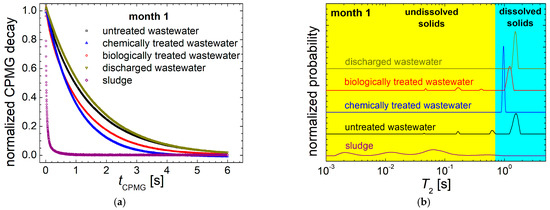 (a) The normalized CPMG decays recorded for the slaughterhouse wastewater (untreated–black square, chemically treated–blue upper triangle, biologically treated–red circle and discharged wastewater–dark yellow lower triangle) and sludge (diamonds) collected in month 1 of monitoring; (b) the normalized T2-distributions of the CPMG decay curves presented in (a).
