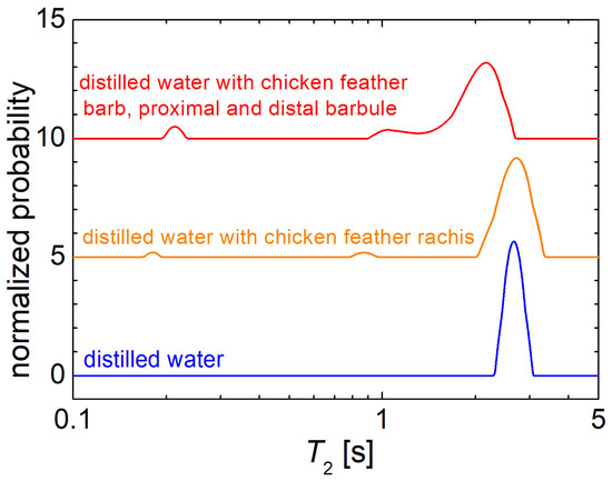 The normalized T2-distributions recorded for distilled water (bottom blue line), distilled water with chickens feather rachis (middle orange line) and distilled water with chicken feather barb and proximal and distal barbule (top red line).