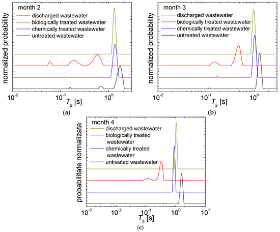 The normalized T2-distributions recorded for the slaughterhouse wastewater: untreated (black), chemically treated (blue), biologically treated (red) and discharged wastewater (dark yellow) collected in (a) month 2; (b) month 3; (c) month 4.