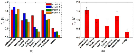 (a) The most probable T2 values measured from the T2-distribution as maximum of the main peak for all wastewater samples (untreated, chemically and biologically treated and discharged wastewater) and sludge collected from a slaughterhouse in months 1 to 4; (b) the average over all months of measurement of the most probable T2 values presented in (a).
