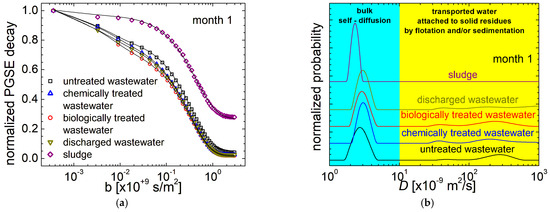 All samples present the largest amount of water as bulk water characterized by the largest peak in the self-diffusion coefficient distribution (Figure 6b). For the first month of monitoring, the wastewater samples (untreated, chemically and biologically treated and discharged wastewaters) presented three peaks, the largest, as mentioned, in the domain of self-diffusion and two of them in the domain of transported water. It is natural to assume that the largest transport coefficient should be associated with water characterized by a large velocity, and therefore a large mobility, specific to the small particles that the water is attached to. On the contrary, if the water molecules are attached to large particles, the mobility of this water-particle system is small. Therefore, the mobility of attached water is small and it is observed as a small apparent diffusion coefficient. The untreated wastewater leads to a broad peak centered at 2.76 × 10−9 m2/s. This becomes narrow as a result of the purification process that reduces the samples’ heterogeneity. A narrow peak was also measured for the sludge sample. The most probable self-diffusion coefficient (the peak maximum) increases from 2.76 × 10−9 m2/s measured for untreated samples of wastewater to 2.76 × 10−9 m2/s to 2.98 × 10−9 m2/s for discharged wastewater, indicating an increased mobility (or reduced restrictions). A large value is obtained for chemically treated wastewater (3.03 × 10−9 m2/s). The lowest most probable self-diffusion coefficient was measured for sludge (2.31 × 10−9 m2/s). This is normal, since this sample contains the largest amount of residue. For the first month of monitoring, the D-distributions for sludge present no peaks in the domain of transported water. This is not due to the fact that there are no residues but, on the contrary, may be due to the fact that the amount of residue is so large that the mobility of water molecules, due to the sedimentation or flotation processes, is strongly reduced. For months of monitoring 2–4, the D-distributions measured for sludge samples presented similar peaks in the water transport domain (see Figure S3 from the Supplementary Information).