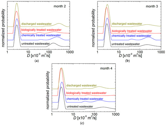 The normalized D–distributions recorded for the slaughterhouse wastewater: untreated (black), chemically treated (blue), biologically treated (red) and discharged wastewater (dark yellow) collected in (a) month 2; (b) month 3; (c) month 4 of monitoring.