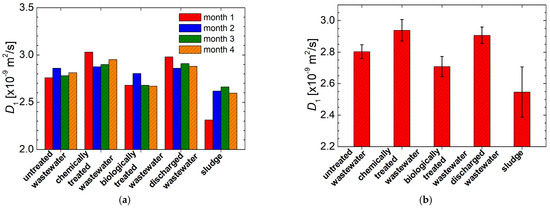 (a) The most probable self-diffusion coefficient D1 values measured from the D–distribution as maximum of the main peak for all wastewater samples (untreated, chemically and biologically treated and discharged wastewater) and sludge collected from a slaughterhouse in months 1 to 4; (b) the average over all months of measurement of the most probable self-diffusion coefficient D1 values presented in (a).