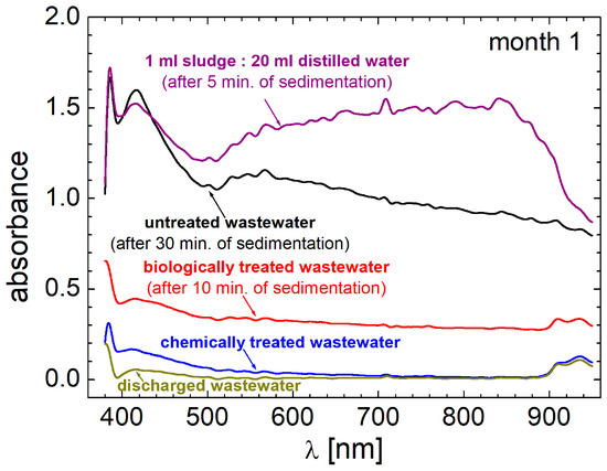 An example of such VIS-nearIR spectra recorded for untreated wastewater (after 30 min of sedimentation), chemically treated wastewater, biologically treated wastewater (after 10 min of sedimentation), discharged wastewater and sludge (1 mL of sludge distilled in 20 mL of distilled water and then measured after 5 min of sedimentation) for samples collected in month 1 of monitoring, are presented in Figure 9. The array sensor of Pasco VIS-nearIR spectrometer allowed us to record the spectra in seconds, therefore, the sedimentation and/or flotation process will not affect the spectral amplitude function of wavelength. This was a problem when a similar measurement was attempted using a step-by-step UV-VIS spectrometer, when the measurement is performed by gradually changing the wavelength, and then the measurement lasted for several minutes. All wastewater and sludge solution present a large absorption in violet light (possible extended in the ultraviolet domain). One can also observe a certain absorption at the wavelength of ~420 nm, then the discharged wastewater, chemically and biologically treated wastewater present a certain decay of the absorbance with the increasing the light wavelength. For these samples, one can observe a certain absorption doublet in the infrared domain at wavelengths larger than 900 nm. For the untreated wastewater, one can observe an additional relative maximum of absorption at λ~560 nm at a so called Chartreuse color between green and yellow. Similar features are observed in sludge solution and in untreated wastewater, except for the fact that the absorbance through the sludge solution is not decaying for wavelengths larger than 560 nm up to ~840 nm that belong to the near infrared domain.