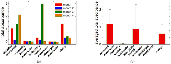 (a) The total absorbance of VIS-nearIR spectra recorded for the slaughterhouse wastewater (untreated, chemically treated, biologically treated and discharged water) and sludge collected in all four months of monitoring; (b) The averaged of total absorbance of VIS-nearIR spectra of wastewater and sludge presented in (a).