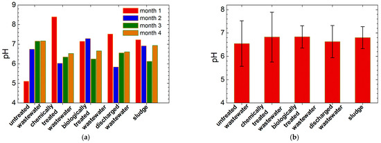 (a) The pH measured for the slaughterhouse wastewater (untreated, chemically treated, biologically treated and discharged wastewater) and sludge collected in all four months of monitoring; (b) The averaged pH over months measured for all four wastewater and sludge samples presented in (a).