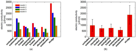 (a) The electrical conductivity (EC) measured for the slaughterhouse wastewater (untreated, chemically treated, biologically treated and discharged wastewater) and sludge collected in all four months of monitoring; (b) the average EC over months measured for all wastewater and sludge presented in (a).