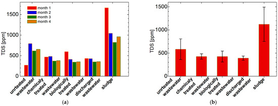 The dissolved and undissolved pollutants will change the electrical conductivity (EC) of slaughterhouse wastewater. Figure 12a presents the measured values for all types of wastewater and sludge (in solution as was prepared for VIS-nearIR spectroscopy) collected in all four months of monitoring. As in the case of pH measurements, large differences of the electrical conductivity values can be observed when comparing samples collected in different months. (The average values together with the standard deviations are presented in Figure 12b). In general, for the same type of dissolved particles, a large value measured for the electrical conductivity implies a large concentration of pollutants. The average values of electrical conductivity σ show a decay when comparing untreated wastewater to chemically and biologically treated wastewater. This showed similar values of σ, while the discharged wastewater is characterized by the smallest σ value. Contrary to pH, in the case of electrical conductivity, the value measured for sludge is substantially larger compared to the values measured for all the types of wastewater. Examining the magnitude of error bars, the first idea is that the electrical conductivity, despite the average values, cannot be used to discriminate between different kinds of wastewater. On the contrary, as we will see in the subchapter dedicated to statistical analysis of principal components, not only can the electrical conductivity be successfully used in differentiation between all four types of wastewater but. together with total dissolved solids, it proves to be an important parameter.