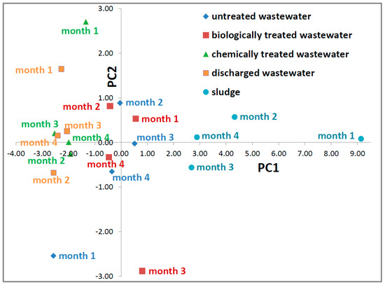 The main PCA analysis: the 2D plot of PC1 function of PC2 for the slaughterhouse wastewater (untreated, biologically treated, chemically treated and discharged wastewater) and sludge samples collected in all four months of monitoring.