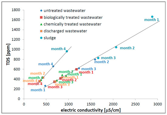 Another important result of our PCA assay is the degree of correlation between all parameters considered in pairs. In the case of wastewater collected from a chicken slaughterhouse, the most correlated parameters were found to be the electrical conductivity, EC, and the total dissolved solids, TDSS. This is not a surprise, since the physical support for electrical conductivity is given by dissolved solids, as distilled water presents poor electrical conductivity. Considering the elements of covariance matrix C (using the MatLab 2020 numeric program, but not from PAST software), and that the eigenvector and eigenvalue problems were solved, a large value can be seen for the elements (there are two symmetrical elements around a main diagonal that have values of 1, meaning that each parameter is perfectly correlated with itself) corresponding to the EC and TDSS parameters. However, the values are not as large as expected. To understand this, in Figure 15, the TDSS is plotted as a function of EC. Now, the correlation coefficient can be better understood. The first observation is that, indeed, the TDSS is well correlated to the EC parameter but, in our case, for all samples collected from the chicken slaughterhouse in four months of monitoring, there are two linear dependences rather than a single one. With one exception, one can see that the data (TDSS and EC) measured for months 1, 2 and 3 of monitoring for untreated, chemically and biologically treated wastewater discharged wastewater and sludge are in a very good linear correlation. In addition, the data collected in the four months of monitoring are arranged in a second linear dependence. Usually, such double linear correlations can be explained: (i) by a change in the treatment process (to include different types of particles with a different electrical behavior); (ii) by a change in dissolved pollutants; (iii) by both causes. In our case, the most probable cause is the fact that the wastewater samples collected in month 4 of monitoring of wastewater were used in the processing of different kinds of chicken (with different origin, size, age, etc.) An interesting observation is the fact that the point corresponding to the discharged wastewater collected in month 2 is placed on the short dependency belonging to month 4.