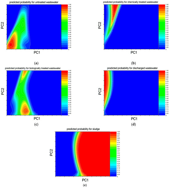 The predicted probability using ANN for (a) the untreated wastewater, (b) chemically treated wastewater (c) biologically treated wastewater (d) discharged wastewater and (e) sludge.