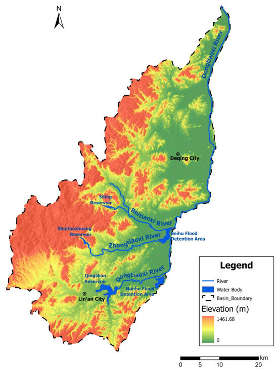 Its upper streams are mountainous rivers. When heavy rainfall occurs, floodwaters quickly flow into the downstream river networks of the Hangjiahu Plain, causing water levels to rise sharply. Additionally, due to the backwater effect of floods in Lake Tai, the drainage capacity of downstream river channels is reduced, putting considerable pressure on regional flood control [30]. The Dongtiaoxi River Basin has undergone several decades of flood control management, adhering to the overall strategy of “retention upstream, detention midstream, and drainage downstream”, which has continuously improved the flood control and drainage engineering system within the basin [31]. There are six reservoirs in the upper basin, functioning as flood retention projects. The midstream area is sequentially arranged with the Nanhu and Beihu, among others, for flood retention and detention purposes. These are the low-lying areas outside river embankments where floodwaters are temporarily stored [32,33]. The storage and detention functions in the upper and middle basins play a crucial role in controlling flood progression.