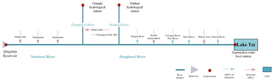 The 1D hydrodynamic model is developed in three reaches: (1) the main river channel from the Qingshan Reservoir to the Lake Tai in Nantiaoxi River–Dongtiaoxi River, (2) the main tributary Zhongtiaoxi River, from Changle hydrological station, and (3) the other main tributary Beitiaoxi River from Panban hydrological station, as shown in Table 4 and Figure 3.