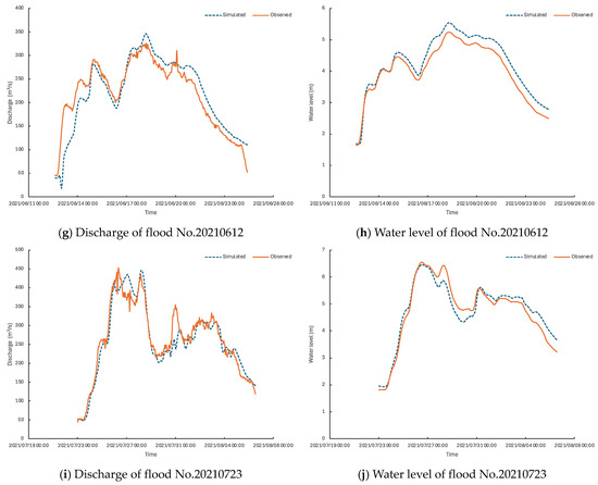 In the case study, the calibration of the Xin’anjiang hydrological model achieves an acceptability rate of 88.9% (eight out of nine), with a Nash–Sutcliffe Efficiency (NSE) coefficient exceeding 0.8 in most cases. The relative error in peak discharge ranges within acceptable limits and the time lag between observed and simulated peak flows is minimal, demonstrating the model’s capability to capture the timing and magnitude of flood peaks accurately. For validation, two flood events in 2021 are utilized, resulting in an acceptability rate of 100% and consistently high NSE coefficients. The 1D hydrodynamic model is calibrated and validated using data from five significant flood events that occurred in recent years. For four out of the five floods analyzed, both flow discharge and water level successfully capture the dynamic interactions between upstream inflows and downstream backwater effects, with relative error and NSE between observed and simulated water levels within acceptable ranges. However, an exception is the flood event of “20190809”, where the simulated results were higher than observed due to a subsequent rising stage following the first flood peak. This high degree of accuracy is critical for making informed decisions about flood management and mitigation. The model’s capability to simulate interactions between basin features provides valuable insights into the timing and magnitude of flood peaks, allowing for better prediction and management of flood events. The 2D hydrodynamic model component provides detailed spatial distributions of inundation extents and depths within flood detention areas, demonstrating the model’s capability to accurately predict flood diversion dynamics and identify critical areas prone to flooding.