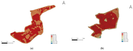 The model uses unstructured irregular grids to discretize the study area, providing more flexibility in grid layout and a more accurate reflection of the terrain characteristics of the computational domain. Grid elevations are linearly interpolated from elevation point data of 1:500 topographic maps. For the Nanhu flood detention area, a grid spacing of 50 m is used, resulting in 2854 grids covering a generalized area of 5.056 km2. For the Beihu flood detention area, a grid spacing of 70 m is employed, resulting in 1424 grids covering a generalized area of 5.69 km2, as shown in Figure 5.