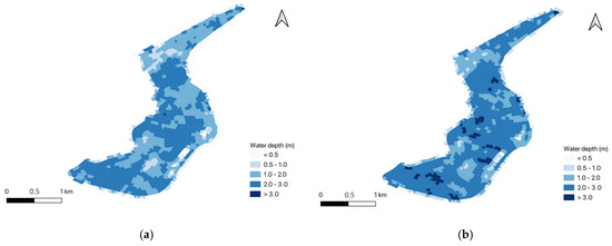 A scenario is simulated when the Beihu diversion gate is open. Figure 6 illustrates the inundation area and depth of the Beihu detention area during two historical floods: Nos. 20190712 and 20200702.