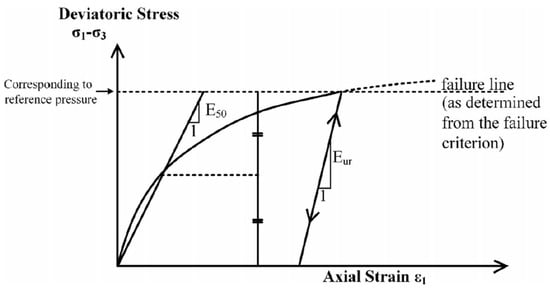 The hardening soil (HS) model in Plaxis is an elastoplastic soil model developed by Schanz et al. []. It calculates deformation using elastic and plastic strain but does not account for hysteretic or cyclic mobility in soils. The model consists of mathematical equations to define soil behavior and is detailed in the Plaxis Material Models Manual []. Users have found the HS model accurate in simulating complex soil behavior under various stress conditions. Model parameters can be determined through conventional triaxial compression tests on the soil (Figure 2). Overall, the hardening soil model is a valuable tool for accurately predicting soil behavior in geotechnical engineering applications []. Therefore, in this study, the zones were modeled using the hardening soil model in order to model the behavior of the dam more realistically.