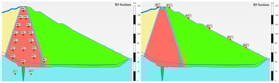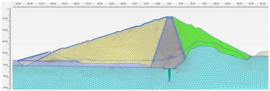 In order to model the dam in detail and realistically, sections and zones were taken from as-built projects. Triangular elements with 15 nodes were used to provide more precise results in the finite element mesh of the section. The test and experimental results of the dam body filling materials used during the construction of the dam, which are necessary to model the realistic behavior of the dam, could not be obtained because laboratory test results obtained during the planning phase and material parameters in the literature were used in the dam model. In the analysis, the “very fine” mesh option offered by the program was selected in order to make the results more precise while creating the finite element mesh, and the mesh was tightened manually in the entire model, being the densest in the impermeable clay core zone. Figure 5 shows images of the model and finite element network created for sections B3, B4, and B5.