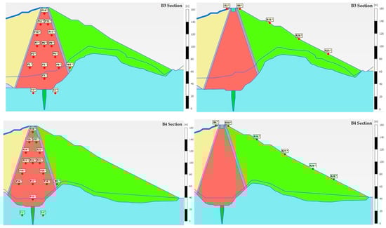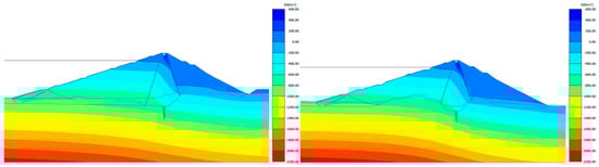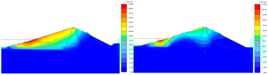 Measuring water pressures in dams is an important step in monitoring the stability and security of embankment dams. Water pressure measurements were taken at İkizdere Dam at different times between 7 January 2010 and 1 March 2023. Some examples of the water pressure outputs obtained for these measurement dates as a result of the two-dimensional analysis of sections B3, B4, and B5 with the finite element model are given in Figure 16 and Figure 17.