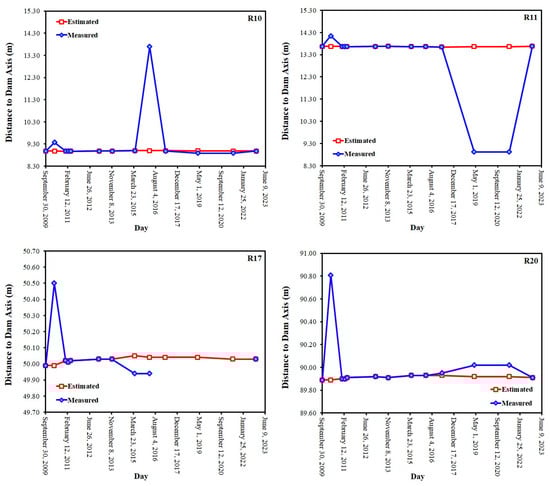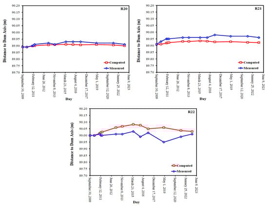 Distance change graphs from the dam axis of the measured and computed values of R20, R21, and R22 survey points.