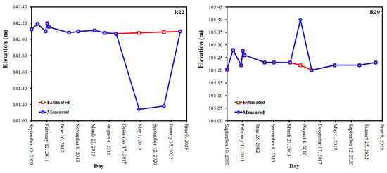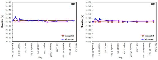 Vertical displacement graphs of measured and computed values of R28 and R29 survey points.