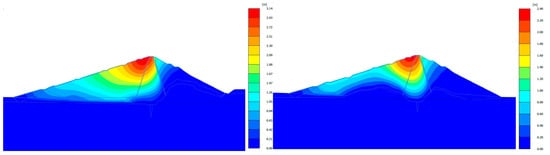 Deformations occurring at survey points provide important information about the behavior of the dam. In the light of this information, comments can be made about dam safety, and the possible behavior of the dam can be predicted. At İkizdere Dam, reference measurements were taken at 13 different times between 30 September 2009 and 9 November 2022. Some examples of the total deformation outputs obtained for these measurement dates as a result of the two-dimensional analysis of the B3, B4, and B5 sections with the finite element model are given in Figure 8 and Figure 9.