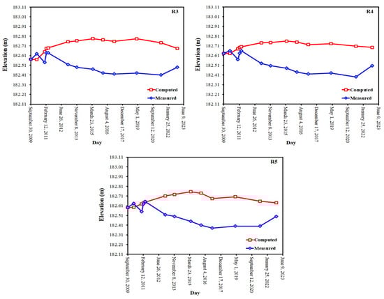 Vertical displacement graphs of measured and computed values of R3, R4, and R5 survey points are given in Figure 10.