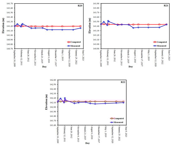 Vertical displacement graphs of measured and computed values of R20, R21, and R22 survey points are given in Figure 11.