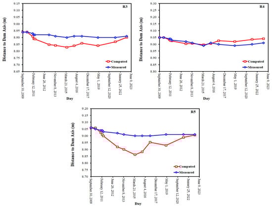Distance change graphs from the dam axis of the measured and computed values of R3, R4, and R5 survey points.