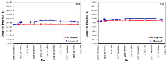Distance change graphs from the dam axis of the measured and computed values of R28 and R29 survey points.