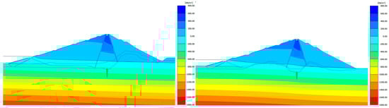 In order to obtain realistic behavior of the dam under different conditions and water levels, the injection curtain and cover injection were modeled using the linear elastic soil model, and all soils in the dam foundation and zones were modeled using the hardening soil model. In soils modeled using the hardening soil model, pref = 100 kN/m2, υur = 0.2, and Eoedref = E50ref and Eurref = 3 × E50ref values recommended to be used by the Plaxis program are defined in the program. The parameters of the materials used in the analysis model are given in Table 2.