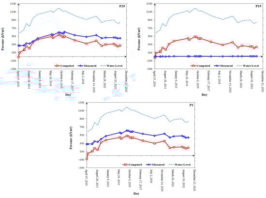Change graphs of measured and computed values of P29, P15, and P1 piezometers.