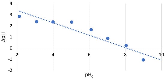 A total of 0.5 g of C. vulgaris powder was weighed into 10 Erlenmeyer flasks. Each flask had 50 mL of NaNO3 added at a concentration of 0.1 M. The pH in each flask was then determined so that the values were 2, 3, 4, 5, 6, 7, 8, 9, 10, and 11. In total, 0.1 M HNO3 and 0.1 M NaOH were used to determine the pH values. The samples were left on an Elpin Plus laboratory shaker for 24 h. After this time, the pH values in each sample were measured again [26]. Based on the obtained initial and final pH values, the value of ∆pH = pH1 − pH0 was calculated.