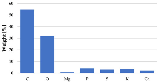 The structure of C. vulgaris is shown in Figure 2. The photos were taken using an SEM VEGA3 TESCAN microscope at various resolutions. These photos are characterized by a large depth of field, which allows for an accurate assessment of porosity on the surface. The structure of the tested biological material can be described as an aggregate of particles of various sizes and microspheres in the form of irregular shapes [38,39,40]. Based on microscopic C. vulgaris images, BSE spectra were made, thanks to which the elemental composition of the biosorbent was determined. The results indicate that C. vulgaris mainly contained carbon and oxygen, and trace amounts of phosphorus, sulfur, silicon, calcium, and magnesium in its composition (Figure 3).