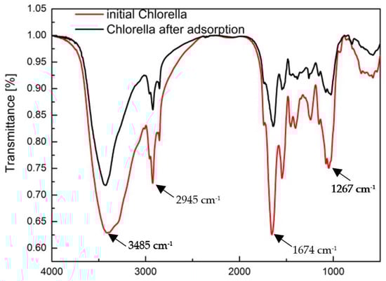 The FTIR spectra of C. vulgaris were obtained with an Alpha spectrometer (Bruker, Billerica, MA, USA). The experiments were conducted using the transmission method, where samples were pressed with potassium bromide. The compressed adsorbent samples were mixed with KBr, maintaining a consistent ratio of 0.25% adsorbent weight to KBr weight, and then pressed into pellets. The FTIR spectra were employed in a spectral range of 4000 to 400 cm−1 [27].