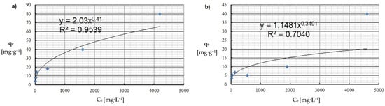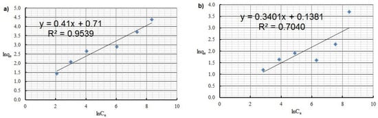 Freundlich isotherm of: (a) Cu(II) and (b) Co(II) ions (pH = 8, Ce = 50–5000 mg·L−1, t = 2 h).