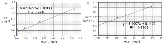 Langmuir isotherm of: (a) Cu(II) and (b) Co(II) ions (pH = 8, Ce = 50–5000 mg·L−1, t = 2 h).