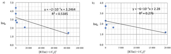 D-R isotherm of: (a) Cu(II) and (b) Co(II) ions (pH = 8, Ce = 50–5000 mg·L−1, t = 2 h).