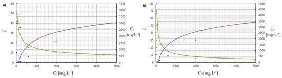 Effect of initial concentration of: (a) Cu(II) and (b) Co(II) ions on the adsorption process (pH = 8, Ce = 50–5000 mg·L−1, t = 2 h).