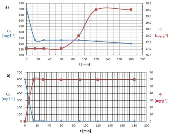 Influence of mixing time on the capacity adsorption (qt) of: (a) Cu(II) and (b) Co(II) ions (pH = 8, Ce = 600 mg·L−1, t = 15–180 min).