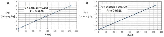 Pseudo-second-order kinetic model (a) Cu(II) and (b) Co(II) (pH = 8, Ce = 600 mg·L−1, t = 15–180 min.