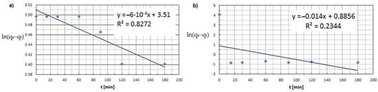 Pseudo-first-order kinetic model (a) Cu(II) and (b) Co(II) (pH = 8, Ce = 600 mg·L−1, t = 15–180 min.