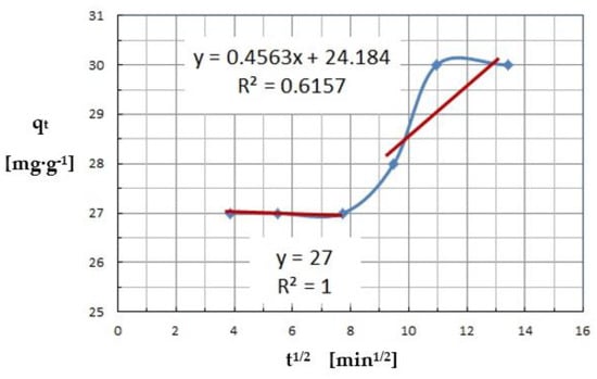 The intra-particle diffusion model shows that there are two or three separate steps in the sorption process, namely external diffusion and intra-particle diffusion. The non-linear course of the entire adsorption process indicates multi-step adsorption of Cu(II) ions by C. vulgaris. The fit of the multilinear dependence of qt concerning t1/2 is shown in Figure 14. It can be observed that there are two or even three distinct stages in the adsorption of copper ions. The sharp linear progression of the first part of the process is related to the diffusive boundary layer (film), so-called external diffusion, external surface adsorption, or external mass transfer effect. The second stage describes the gradual adsorption, surface diffusion, and adsorption on the pore surface, while the third linear relationship is responsible for the diffusion into the pore, which represents the final stage of the equilibrium state, where adsorption becomes very slow, stable, and assumes a maximum value.