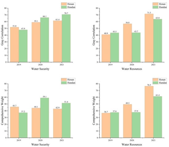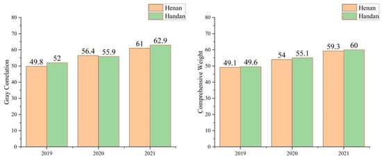 Water resources scores are shown in Figure 2. The overall trend of the two weight fittings is basically the same. The indicator weight of B1 in the comprehensive weight is higher, resulting in higher comprehensive evaluation scores within Henan in 2021; for the rest of the years, the overall score of the gray correlation is higher than that of the comprehensive weight. This is mainly because the overall distribution of the gray correlation weight is more evenly distributed, and B3 and B4 in the comprehensive weight are less heavily weighted. Among them, a comparison was made between the situation of Handan and the Weihe River Watershed in Henan, revealing significant differences between 2021 and 2020. The primary factor behind these differences lies in the impact of water resource regulation by Yuecheng Reservoir on Handan and its jurisdiction over the Weihe River Watershed during both years, enabling effective allocation of water resources. In the Weihe River Watershed, watershed replenishment led to rational allocation of water resources across various water systems under adequate supply conditions. Consequently, overall scores for 2021 and 2020 were relatively favorable. However, in 2020, there existed an imbalance in the allocation of water for residential use, production, and ecological purposes in Handan; thus, while the overall score improved compared to previous years, it remained lower than that of Henan for the Weihe River Watershed. In 2019, the Weihe River Watershed experienced an overall dry state with very low watershed levels. Nevertheless, regulation by Yuecheng Reservoir’s management of water resources at that time resulted in slightly higher overall levels compared to those within Henan’s portion of the Weihe River Watershed