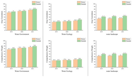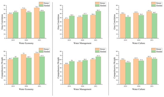 The water culture scores are shown in Figure 3, with a high degree of fit of the two weights. The comparison between Handan and Henan of the Weihe River Watershed shows that the level of water culture creation in Henan is overall higher than that in the Weihe River Watershed in Handan. The dimension of water culture primarily manifests in the preservation of historical water culture and the establishment of contemporary water culture. The overall level of water culture in the Weihe River in Henan and Handan has exhibited a slight upward trend from 2019 to 2021, but the increase was marginal, resulting in an overall poor level. The development of water culture along the Weihe River Watershed is predominantly focused on preserving historical sites and significant geographical locations, such as the Grand Canal Wharf Site in Huaxian County, Henan Province, and the Yecheng Ruins in Linzhang County, Handan City. However, compared with developed areas, there remains a considerable gap in terms of both development and protection efforts for water cultural heritage. A comparison between the levels of water culture along the Weihe River Watershed reveals that Henan possesses numerous invaluable treasures related to its rich history as a cradle of Chinese civilization; this natural advantage provides fertile ground for advancing historical water culture. Nevertheless, further efforts are needed to enhance and expand upon the historical aspects of water culture along the Weihe River Watershed while drawing inspiration from developed regions to establish a modern corridor for nurturing contemporary water culture.
