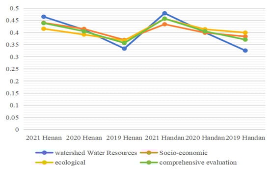(1) Using the integrated evaluation model of the three major subsystems of watershed water resources, socio-economic, and ecological subsystems in the Weihe River eco-watershed, the integrated evaluation index of the Weihe River Watershed in Henan Province and the Weihe River Watershed in Handan City for 2019–2021 is calculated as shown in Figure 6. It can be seen that, under the influence of drought in 2019 and flooding in 2021, the subsystems of watershed water resources have undergone a larger change, and the subsystems of watershed water resources in Henan exhibit an overall improving trend, characterized by a year-on-year increase in the watershed’s water resources. However, the uncoordinated annual water supply poses a significant threat to water security. In comparison to Handan, the ecological subsystem in Henan demonstrates a slower growth rate and relatively lower overall level. In Henan, there are no major water control projects along the main stream of the Weihe river. The river primarily functions as a flood control channel while also providing irrigation support. However, due to challenges in balancing annual water resources, occasional riverbed drying occurs, leading to an extremely fragile ecological condition. However, in Handan, the confluence of the Weihe River and the Zhanghe River exhibits an improved overall water ecology attributed to the regulation and storage of Yuecheng Reservoir. Concurrently, recent years have witnessed a discernible impact of legal measures and the deepening river chief system on the water environment’s influence on river channels, leading to a consistent upward trend in ecological subsystems; the socio-economic subsystem of Handan experienced slower growth from 2019 to 2021 under the influence of the epidemic. Prior to the emergence of the epidemic at the end of 2019, Handan’s overall economic situation outperformed that of the Henan. However, as the epidemic progressed, Handan experienced a slowdown in economic growth. This can be attributed to the fact that Henan’s economic support was primarily driven by industrial and agricultural sectors, whereas Handan, being a comprehensive city with a large population, was more susceptible to the impact of the epidemic. The comprehensive assessment trend for the Weihe River Watershed showed consistent improvement year by year, with Handan generally maintaining better conditions than Henan due to the regulatory function of Yuecheng Reservoir.