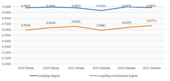 In the formula, C is the degree of coupling, D is the degree of coupling coordination, T is the comprehensive evaluation index of the level of coupling coordination and development, and α, β, and γ are the weights of each subsystem, respectively.