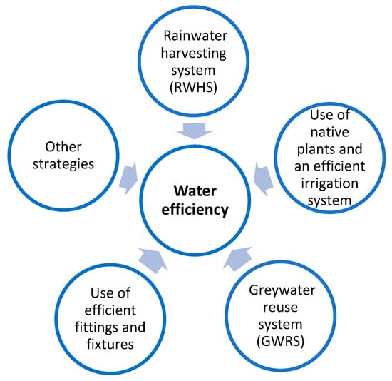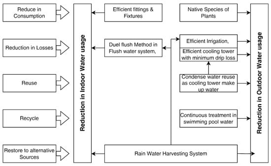 Water efficiency in a building can be achieved by applying the principle of the 5Rs: reduction in consumption, reduction in losses and waste, re-use, recycle and resort to alternative sources, as stated by [65]. These principles were incorporated into the LEED rating system [66]. Hence, the researcher deployed methodologies outlined in the LEED guidelines, as presented in Figure 3. A detailed description of each strategy to achieve the anticipated water consumption efficiencies in an office building in a hot, humid climate is provided below.